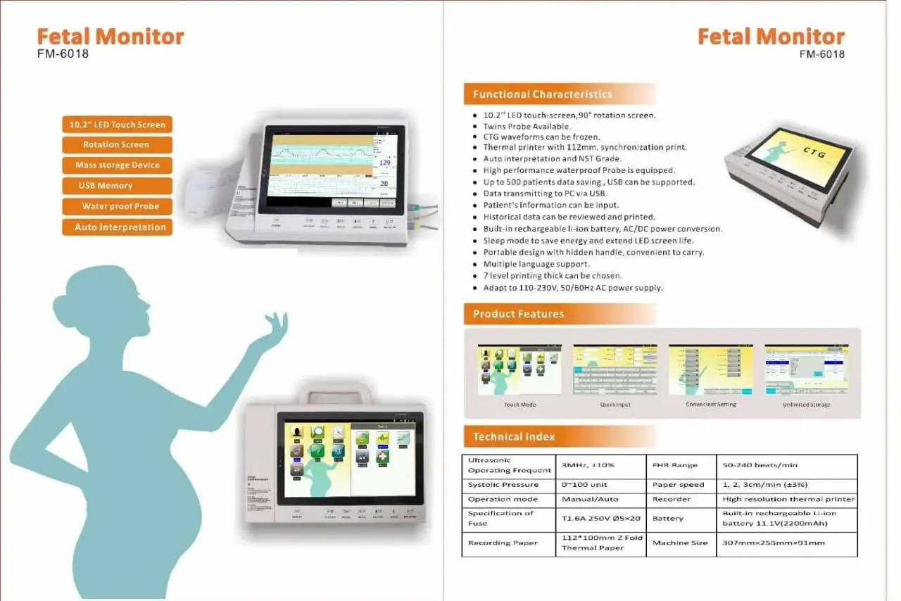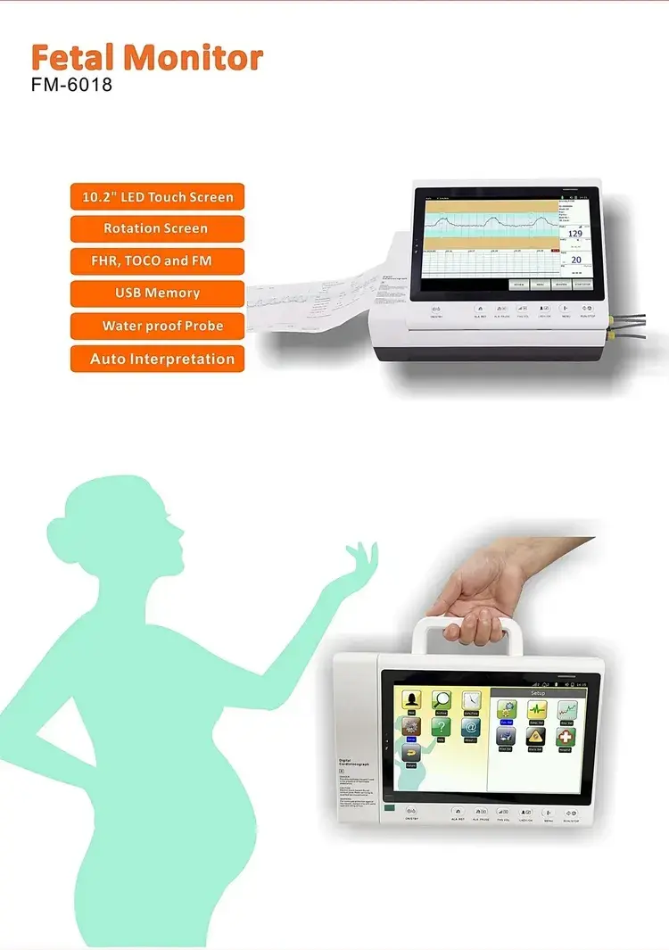 The FM-6018 Baby Fetal Monitor Portable CTG Machine is an advanced medical-grade device designed for expectant mothers and healthcare professionals to monitor fetal heart rate and uterine contractions accurately. This portable cardiotocography (CTG) machine combines hospital-level precision with user-friendly operation, allowing you to track your baby's well-being anytime, anywhere. With its clear digital display and reliable detection technology, it provides peace of mind during pregnancy while maintaining clinical accuracy standards.